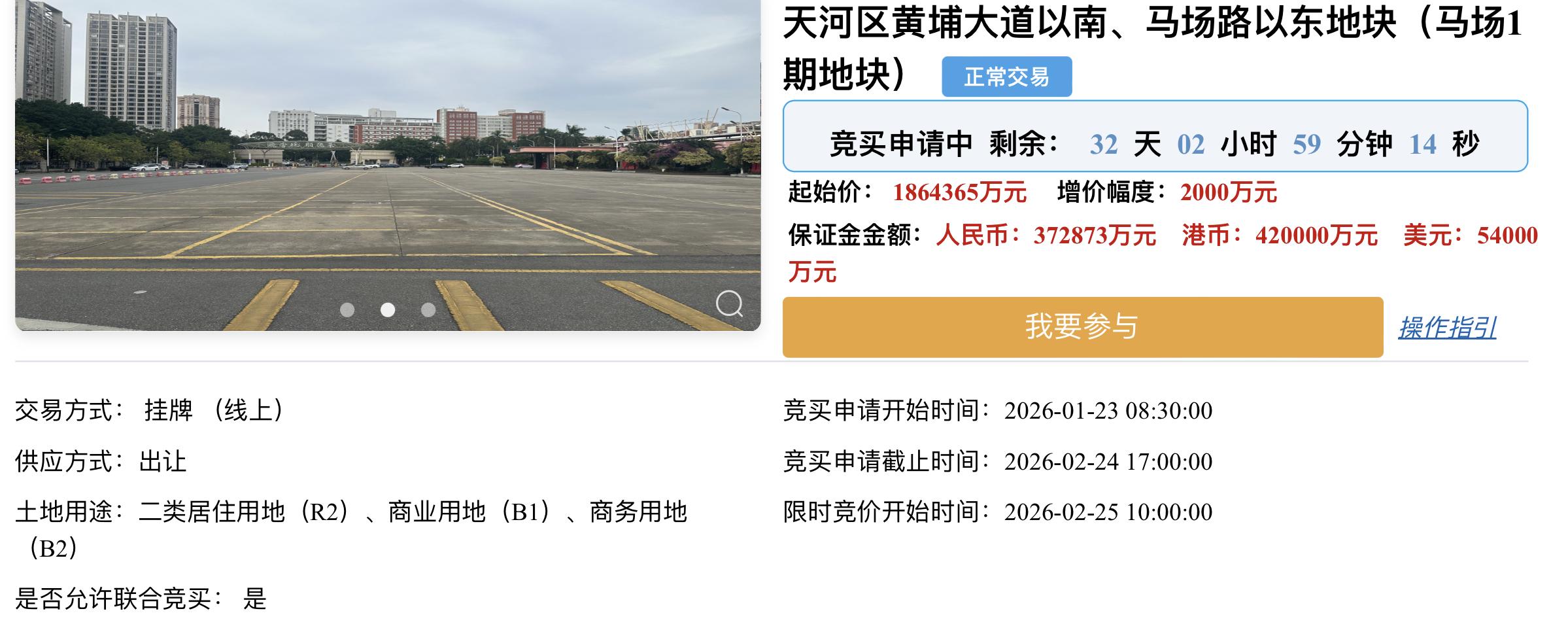 【广州出让一超级巨无霸地块 起拍总价达186.4亿元】财联社1月23日电,广州市规划和自然资源局今日发布公告,正式挂牌天河区马场1期地块。该地块位于天河区黄埔大道以南、马场路以东,用地性质为综合用地(含住宅),宗地面积194500平方米,规划建筑面积566962平方米,起始价高达186.44亿元,起始综合楼面价32883元/平方米。该地块竞买申请截止时间为2月24日,限时竞价时间为2月25日上午10时。据中指院信息,这一起始总价刷新广州涉宅用地起始价TOP2纪录,仅次于荔湾区芳村大道南以东地块1