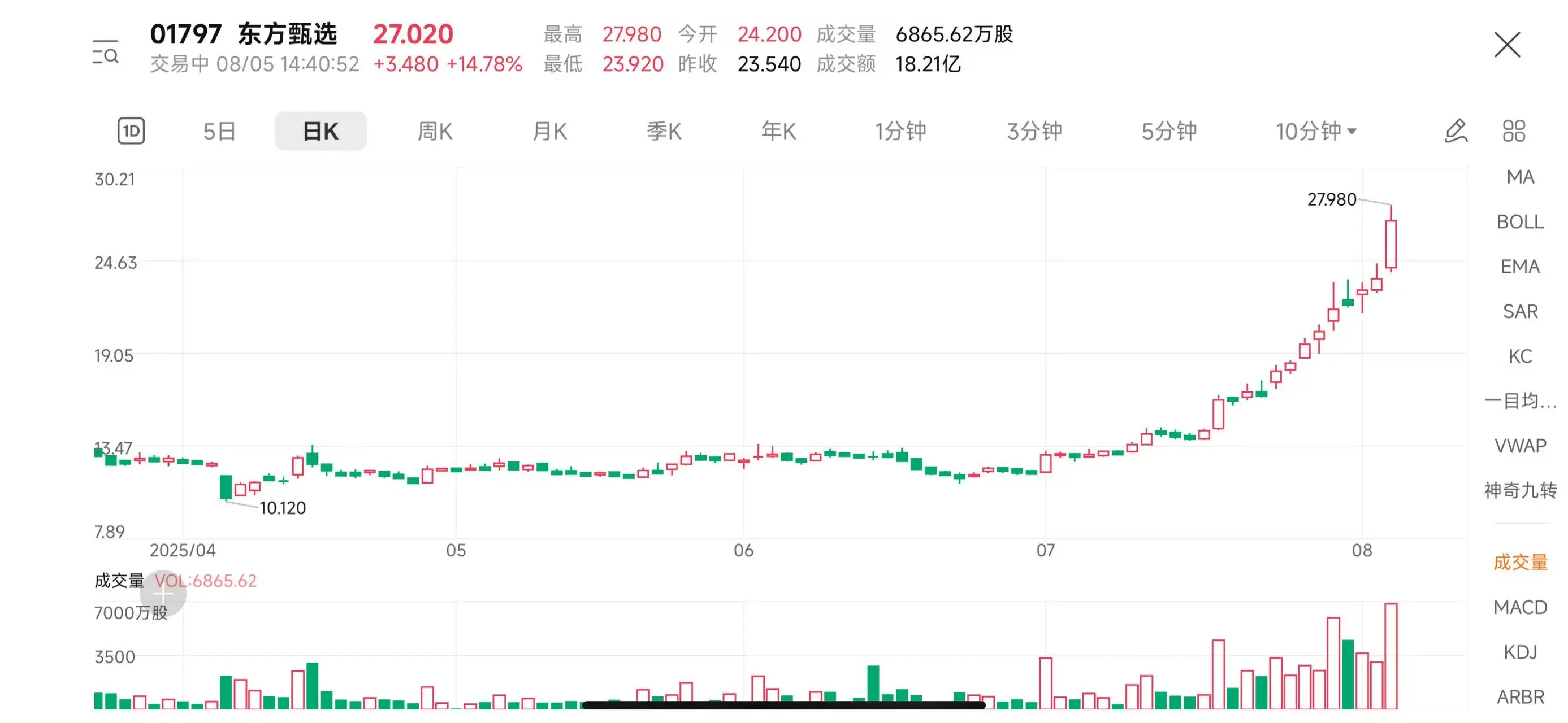 8月5日讯(编辑 冯轶)今日东方甄选(01797.HK)股价大幅拉升,引发市场关注。