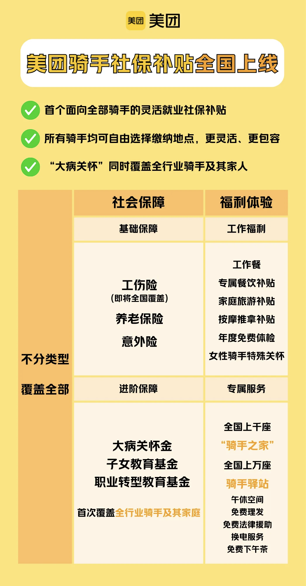 【美团骑手社保补贴全国上线】《科创板日报》27日讯,27日晚间,美团官方公众号“美团Meituan”发布公告,即日起,美团骑手养老保险补贴将正式覆盖全国,向全部骑手开放。11月开始,骑手可根据自身需求,选择在户籍地或工作所在地缴纳。具体规则可在骑手App或当地社保咨询点查阅。公告表示,这是行业首个面向全部骑手开放的社保补贴方案。不管是长期稳定跑单,还是过渡兼职的骑手,都可灵活自主参与。