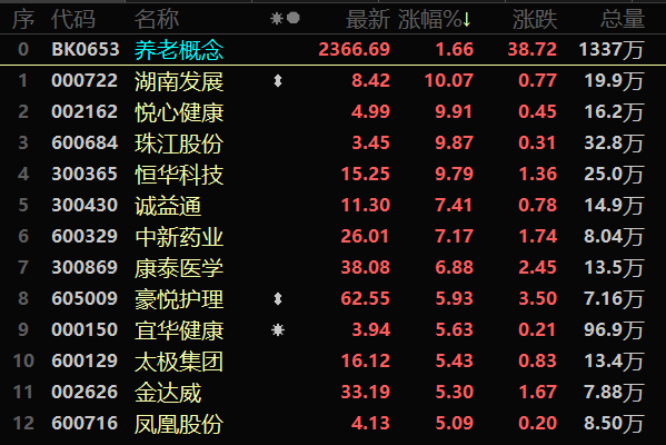 (上海,编辑 梓隆)讯,今日,养老板块大幅高开,个股也普遍走强,截止午间收盘,湖南发展、悦心健康、珠江股份三股涨停,恒华科技涨逾9%,诚益通、中新药业、康泰医学、豪悦护理、宜华健康等股涨幅居前。