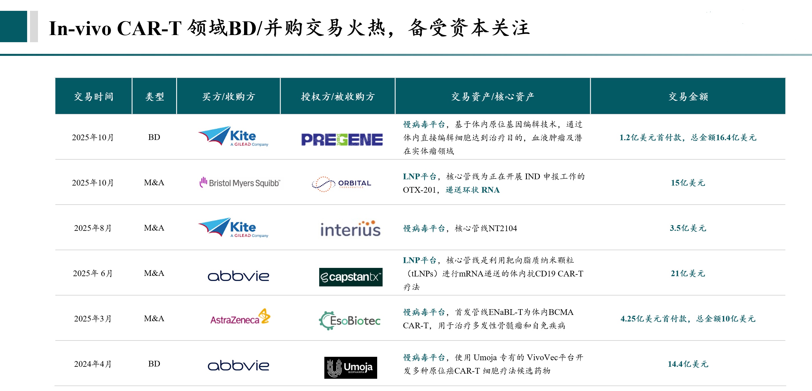自2025以来,已有包括阿斯利康艾伯维、吉利德等跨国药企巨头通过授权引进或并购方式强势切入该赛道。就在今年10月,百时美施贵宝以15亿美元现金收购了体内CAR-T公司Orbital,强化了其在细胞治疗领域的产品布局。
