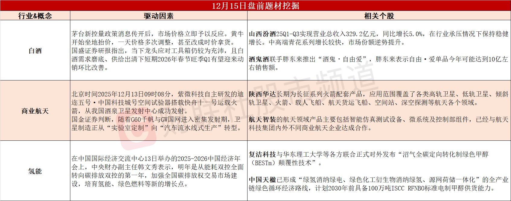 【盘前题材挖掘】①黄牛坐地起价!白酒龙头给出积极信号,2026年板块估值修复可期。②民营太空飞船成功升空,我国商业航天发展迈入新阶段。③顶层关注度提升,氢能产业链有望迎来发展大机遇。