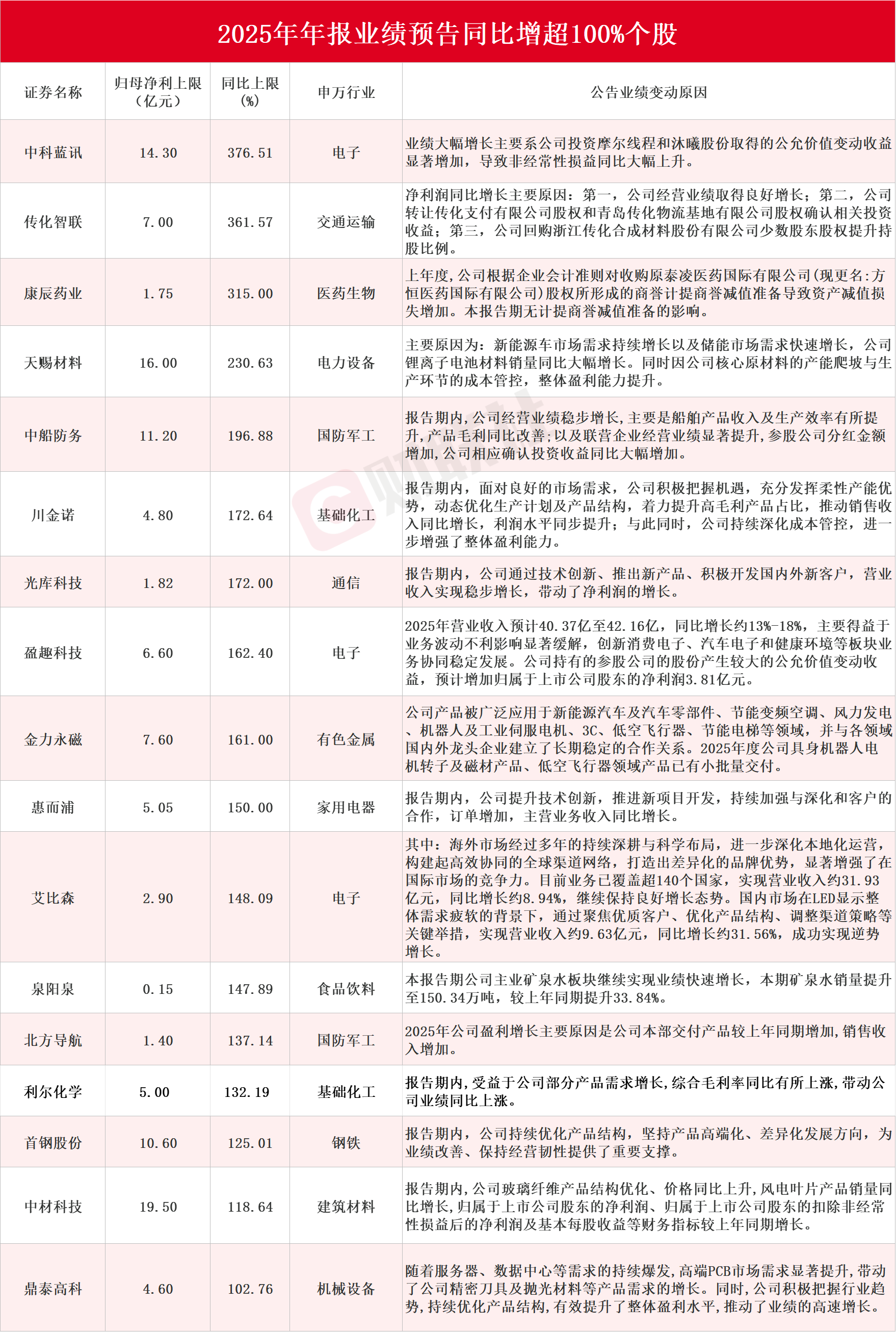据Choice数据统计,截至发稿,共有87家A股上市公司发布2025年年报预告。剔除新股、次新股后,中科蓝讯、传化智联、康辰药业、天赐材料、中船防务、川金诺、光库科技、盈趣科技、金力永磁、惠而浦、艾比森、泉阳泉、北方导航、利尔化学、首钢股份、中材科技和鼎泰高科在内的17只个股归母净利同比预增上限超100%(具体情况见下图)。此外,南兴股份预计2025年归属于上市公司股东的净利润为9000万元-1.2亿元,同比实现扭亏为盈。