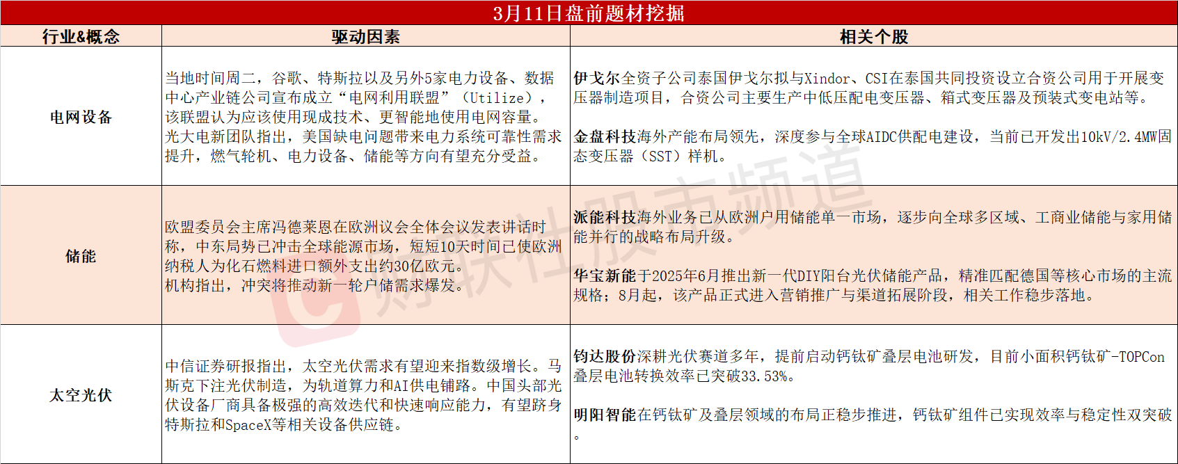 【盘前题材挖掘】①谷歌和特斯拉组建“电网利用联盟”,AI缺电逻辑有望持续演绎。②欧洲已为燃料进口额外支出约30亿欧,冲突或推动新一轮户储需求爆发。③太空光伏需求有望迎指数级增长,中国光伏厂商打开全新成长空间。