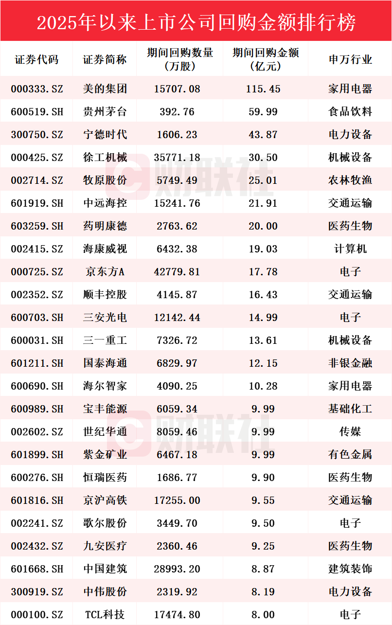 【年内近1500家A股公司实施股份回购 累计金额超1390亿元 美的集团回购额115亿元】财联社12月31日电,Choice数据显示,截至发稿,2025年以来,已有1494家上市公司实施股份回购,累计回购金额为1392.84亿元。从上市公司回购的金额来看,有14家公司回购金额超过10亿元。其中,美的集团回购额位居榜首,金额达115.45亿元;贵州茅台回购额为59.99亿元位列第二;宁德时代回购额为43.87亿元位列第三。此外,徐工机械回购额为30.5亿元,牧原股份、中远海控、药明康德回购额均超2