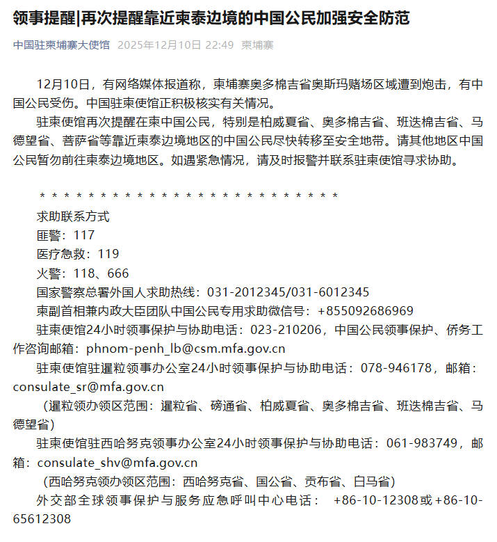 驻柬使馆再次提醒在柬中国公民,特别是柏威夏省、奥多棉吉省、班迭棉吉省、马德望省、菩萨省等靠近柬泰边境地区的中国公民尽快转移至安全地带。请其他地区中国公民暂勿前往柬泰边境地区。如遇紧急情况,请及时报警并联系驻柬使馆寻求协助。