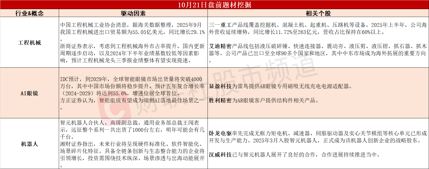 【盘前题材挖掘】①9月工程机械出口额同比增长29.6%,工程机械龙头三季报业绩有望提速。②五年复合增长率或将达到55.6%,我国智能眼镜市场未来潜力巨大。③智元机器人今年营收或增超10倍,产业链驶入发展“快车道”。
