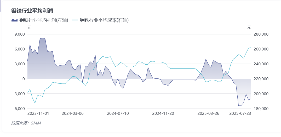 “几家欢喜几家愁”,钼价的快速上涨严重蚕食了产业链中下游利润。首先受到冲击的是中游的钼铁冶炼端,据SMM数据,截至7月底,钼铁价格倒挂一吨约3000元左右。