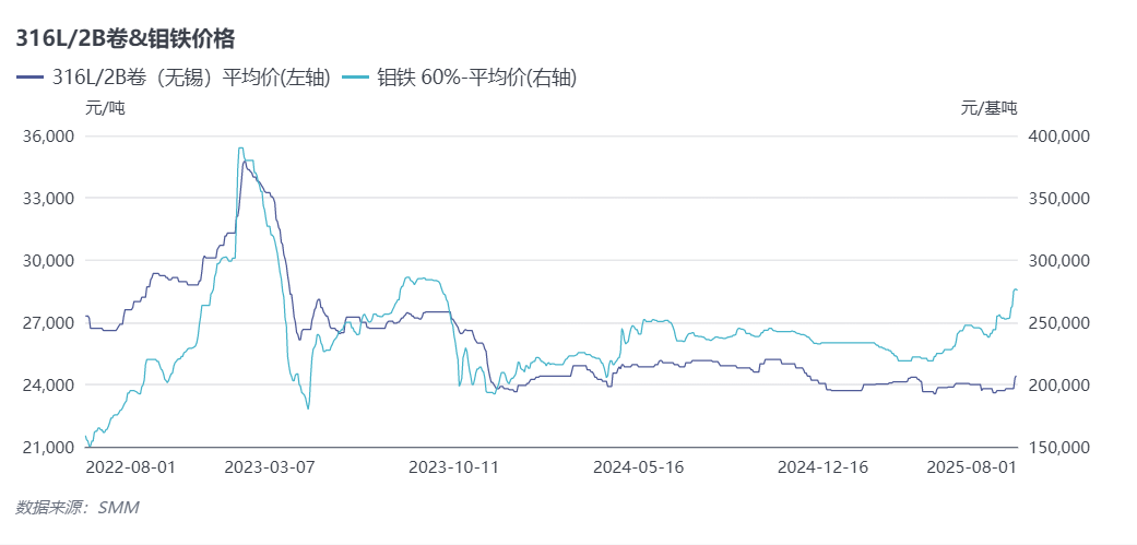 再看下游的含钼不锈钢,价格几乎处于“躺平”状态。SMM数据显示,今年以来,316L/2B卷(无锡)平均价维持在2.4万元/吨左右。