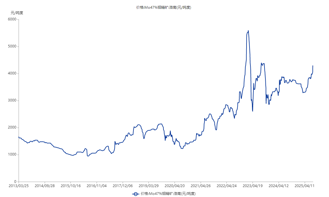 值得注意的是,在2022年底-2023年初时,钼价涨势更猛,洛南地区47%品位的钼精矿曾涨至5600元/吨度,此后两个月腰斩至2600元左右。