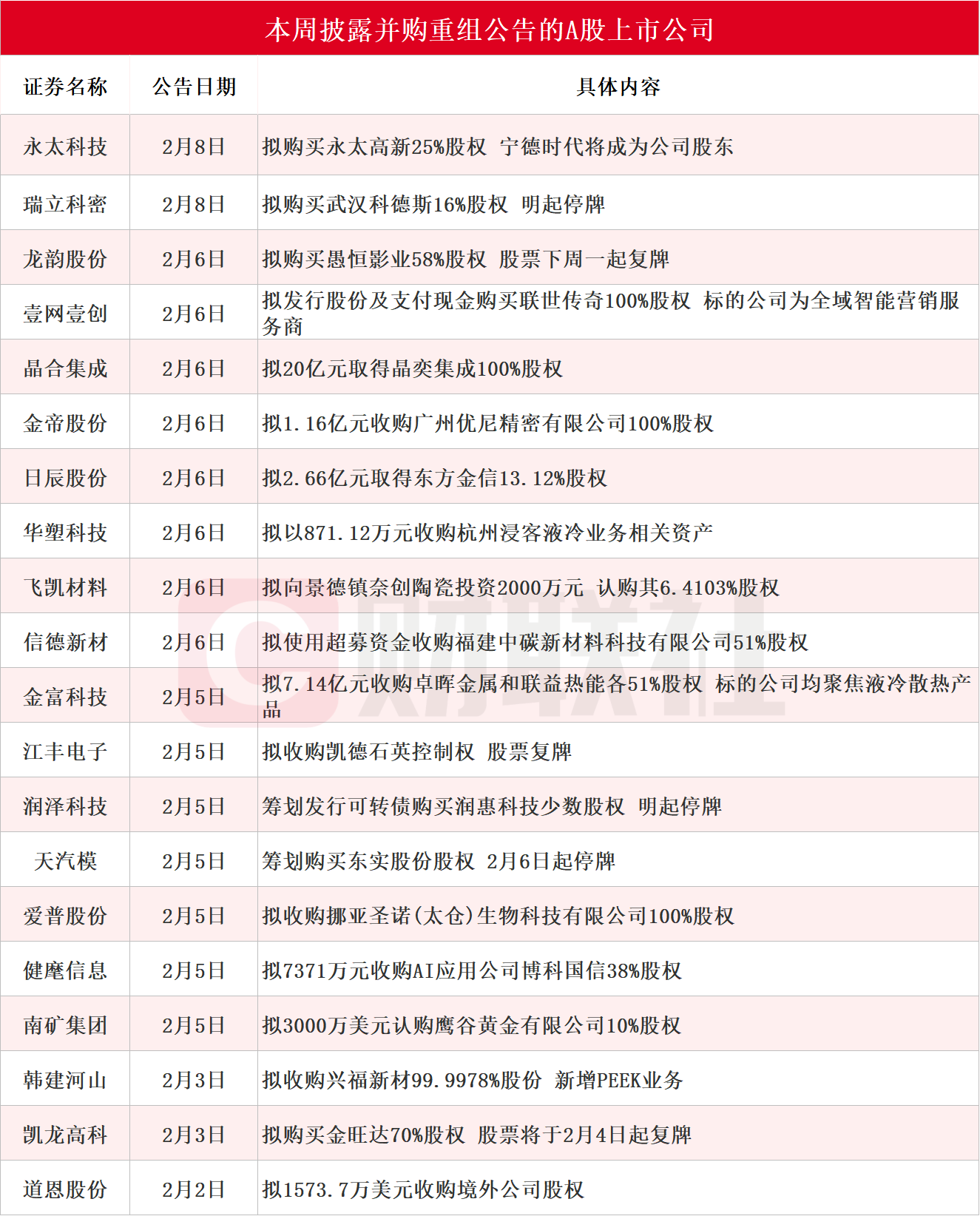 【二十家A股上市公司本周披露并购重组最新公告 永太科技拟购买宁德时代持有的永太高新25%股权股票停牌】财联社2月8日电,据财联社不完全统计,截至发稿,本周(2月2日-2月8日)包括永太科技、瑞立科密、龙韵股份、壹网壹创、晶合集成、金帝股份、日辰股份、华塑科技、飞凯材料、信德新材、金富科技、江丰电子、润泽科技、天汽模、爱普股份、健麾信息、南矿集团、韩建河山、凯龙高科和道恩股份在内的20家A股上市公司披露并购重组进展最新公告。其中,永太科技拟购买永太高新25%股权,宁德时代将成为公司股东。