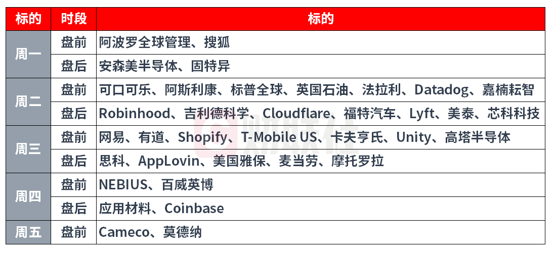 在下周的公布财报的公司中,就有Unity、AppLovin、标普环球、Robinhood等身处风暴中央的软件公司,他们的表现和管理层表述将验证这一轮抛售是否合理。随着财报季逐渐进入尾声,可口可乐、麦当劳等知名公司也将公布业绩。投资者也将关注思科、应用材料这类“向AI巨头卖铲子”的产业链公司对AI需求的最新描述。