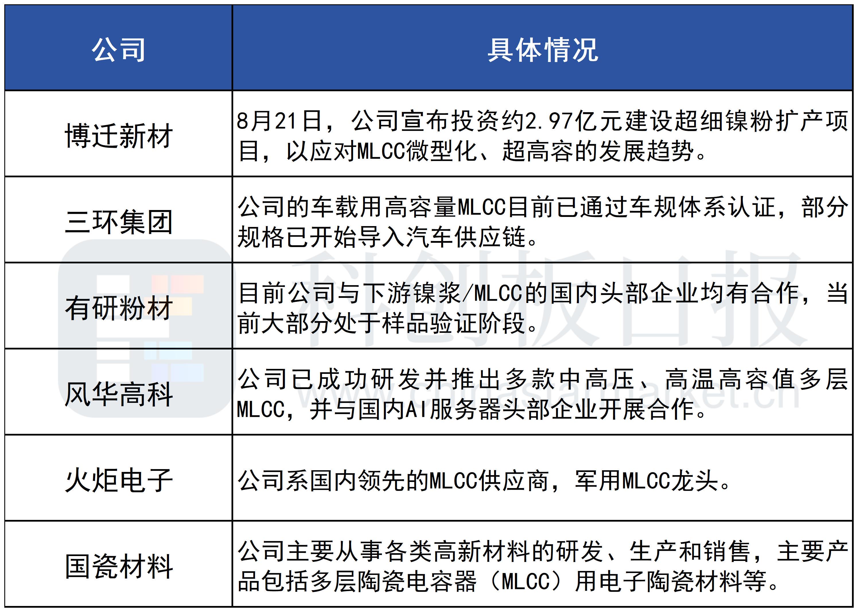从投资层面来看,上述券商表示,上游原材料粉体是MLCC核心之一,壁垒高。其中陶瓷粉料是MLCC核心材料之一,其质量和配比对MLCC性能影响较大,目前高端陶瓷粉料技术主要由日本和美国厂商主导,国内厂商正加速突破。此外,AI将推动高端MLCC及高端纳米镍粉需求增长,纳米镍粉粒径需求越来越细。