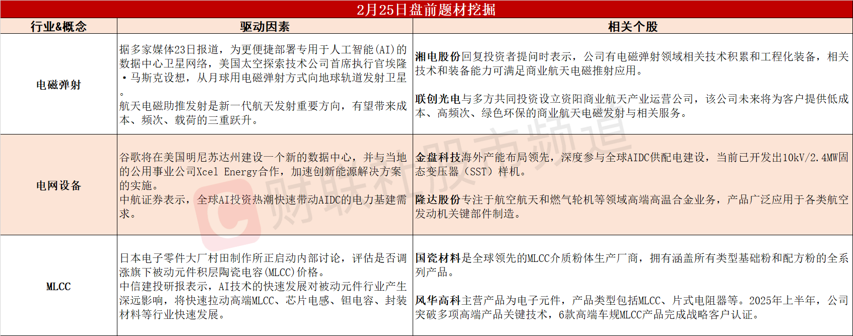 【盘前题材挖掘】①马斯克设想从月球电磁弹射AI卫星,电磁发射有望成商业航天重要方向。②AI投资热潮带动电力基建需求,机构称这些环节有望放量。③AI服务器的关键元件,全球最大MLCC厂商考虑涨价。