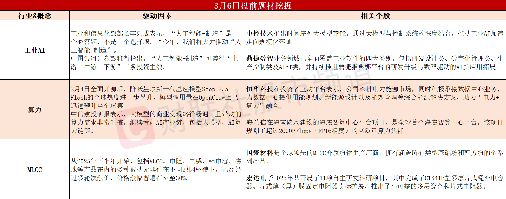 【盘前题材挖掘】①工信部今年将大力推动“人工智能+制造”,工业智能化赛道迎来强催化。②大模型商业变现路径畅通,有望带动算力需求持续旺盛。③AI快速发展拉动需求,机构称MLCC涨价周期有望延续至2026年。
