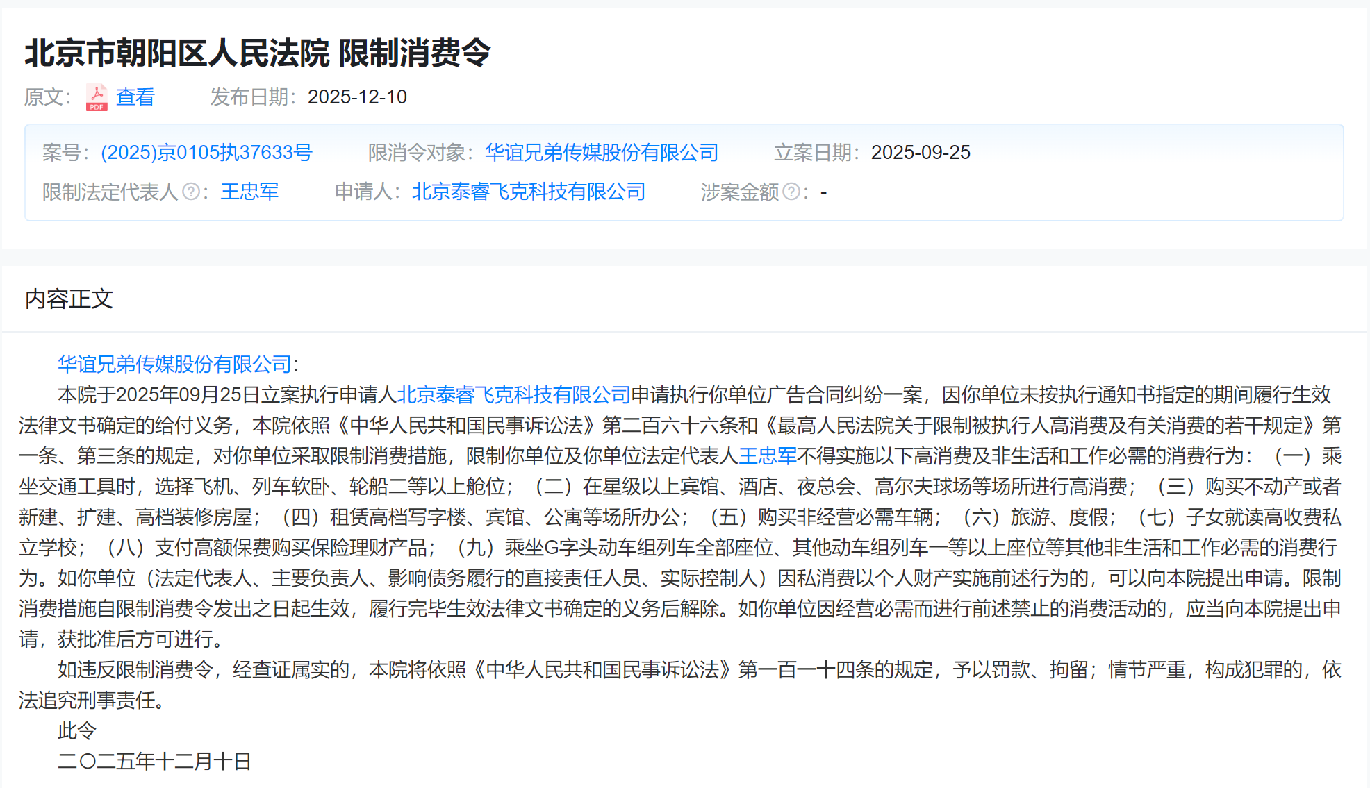 据天眼查官网显示,近日华谊兄弟旗下两家核心公司华谊兄弟电影有限公司、华谊兄弟传媒股份有限公司及其法定代表人王忠磊、王忠军被北京市朝阳区人民法院限制高消费,涉及7473万元执行案件。
