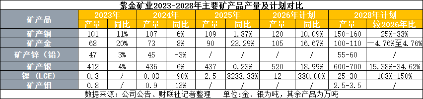 这意味着,2028年,紫金矿业最主要的两大产品——矿产铜、矿产金在当年的产量,较2026年计划产量变化幅度分别为25%至33%、-4.76%至4.76%。