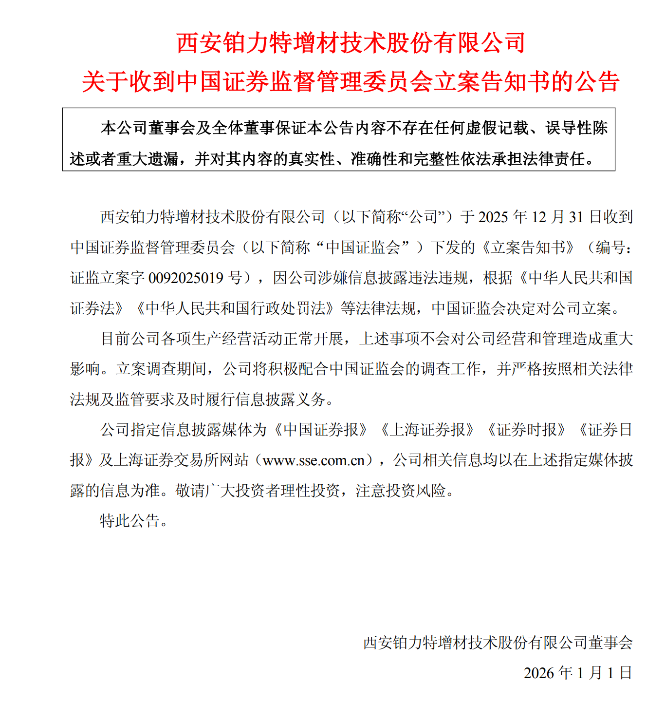 铂力特(688333.SH)今日公告称,公司于2025年12月31日收到中国证监会下发的《立案告知书》,因公司涉嫌信息披露违法违规,中国证监会决定对公司立案。