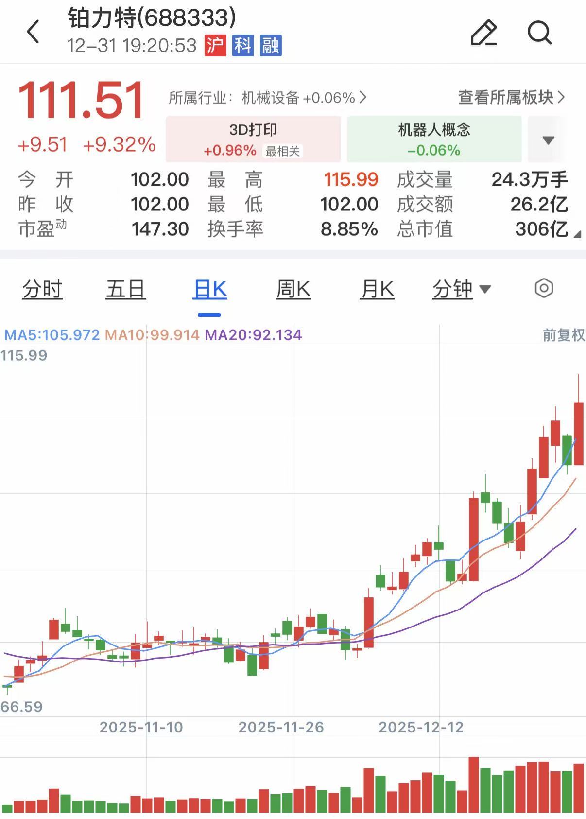 截至今日收盘,铂力特股价报收111.51元/股,股价再创历史新高,总市值306亿元。值得注意的是,该股12月单月涨近42%,今年股价大涨183%。