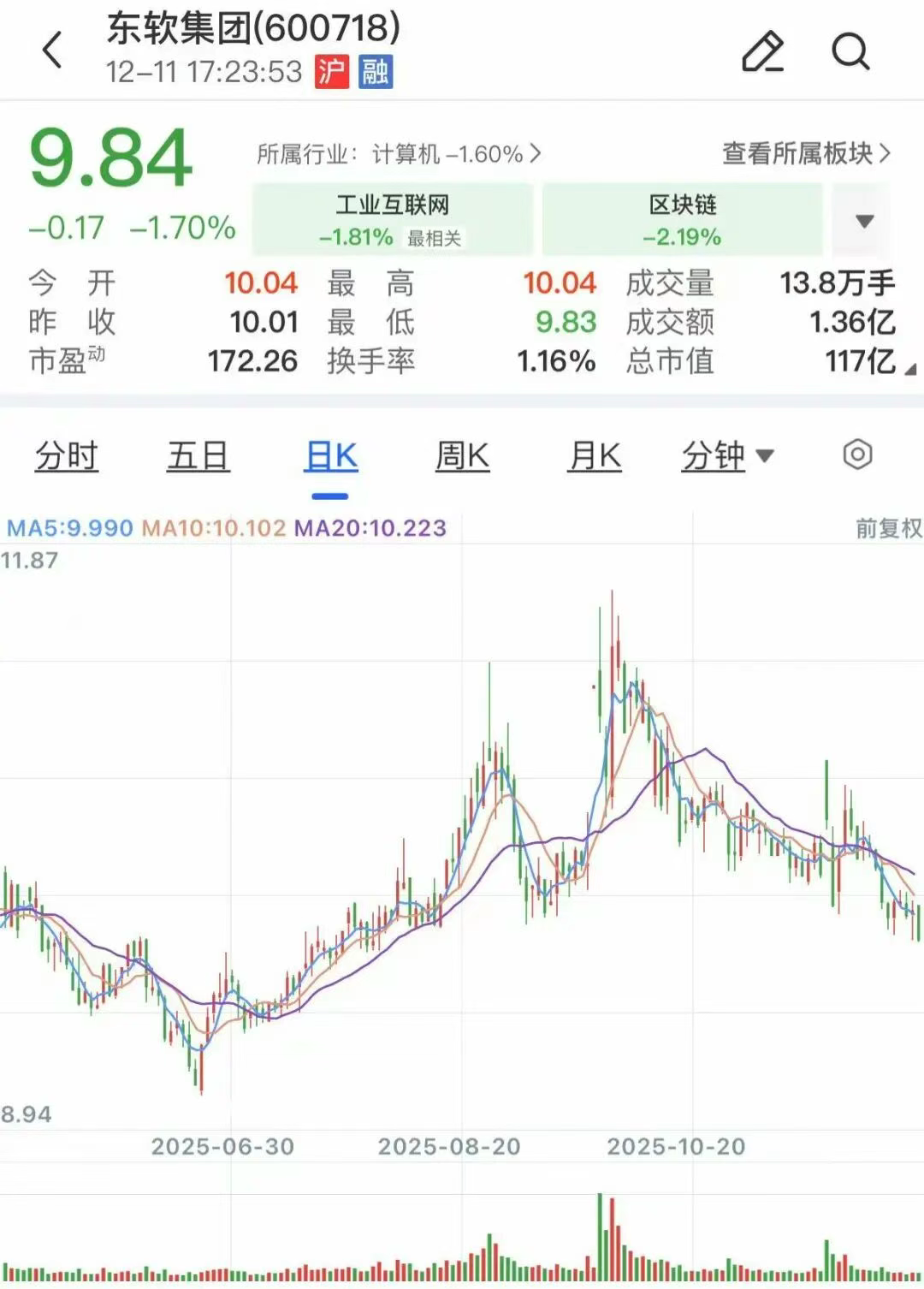 截至今日收盘,东软集团报收9.84元/股,总市值117亿元,今年以来股价累计下跌7.34%。