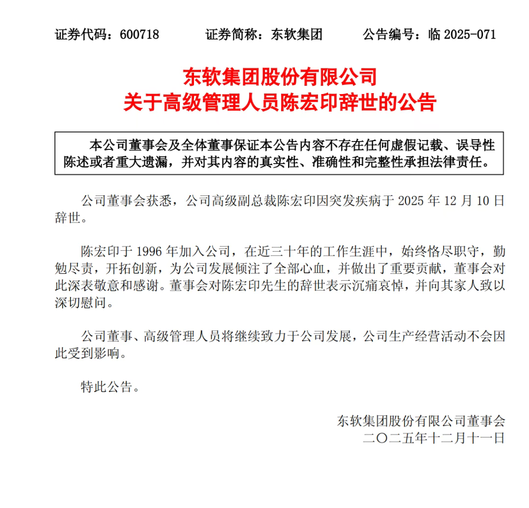 12月11日讯,东软集团(600718.SH)今日公告称,公司高级副总裁陈宏印因突发疾病于2025年12月10日辞世。