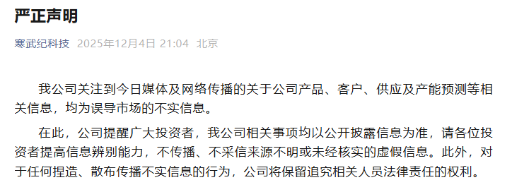 12月4日讯,“寒武纪科技”微信公号发布严正声明称,公司关注到今日媒体及网络传播的关于公司产品、客户、供应及产能预测等相关信息,均为误导市场的不实信息。