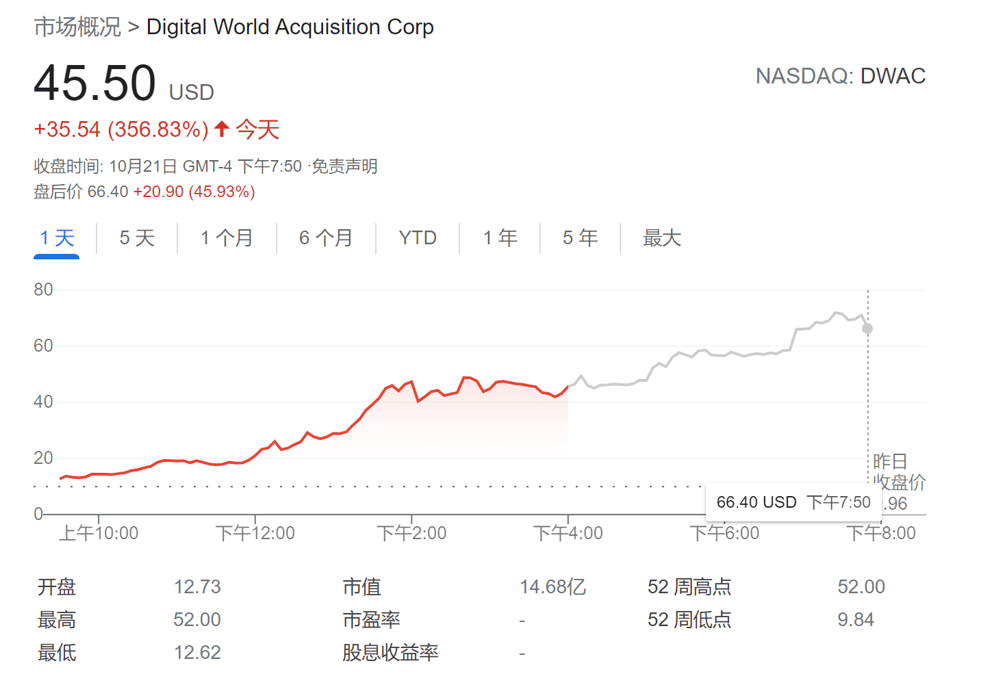 (上海,编辑 黄君芝)讯,随着特朗普决心推出新的社交媒体平台,并计划与SPAC公司Digital World Acquisition Corp.合并上市,后者股价周四一路飞涨,甚至因大幅波动而多次短暂停止交易,“DWAC”这一名字瞬间在各大社交媒体网站流行了起来。