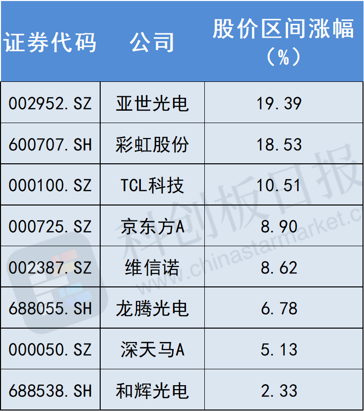 值得注意的是,10月12日至今日收盘,面板厂商中,亚世光电、彩虹股份、TCL科技的股价区间涨幅超10%,期间彩虹股份一度涨停。
