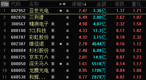 《科创板日报》10月14日讯(编辑 宋子乔)面板板块今日继续上涨。截至收盘,亚世光电、三利谱涨超6%,精测电子、TCL科技、彩虹股份涨超4%,维信诺、杉杉股份、京东方等纷纷跟涨。