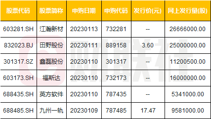 下周将有6只新股发行,沪市主板2只,科创板2只,创业板1只,北交所一只。下周一可申购九州一轨,下周二可申购英方软件、福斯达、鑫磊股份,下周三可申购田野股份,下周五可申购江瀚新材。