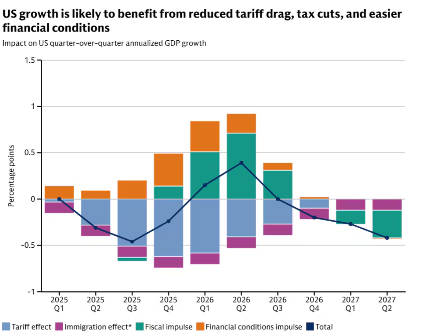 哈祖斯预计,上述因素带来的推动作用将在2026年上半年集中显现,此外美国政府停摆后的复苏也将起到提振作用。“我们预计(美国)明年上半年GDP增长将尤为强劲。”