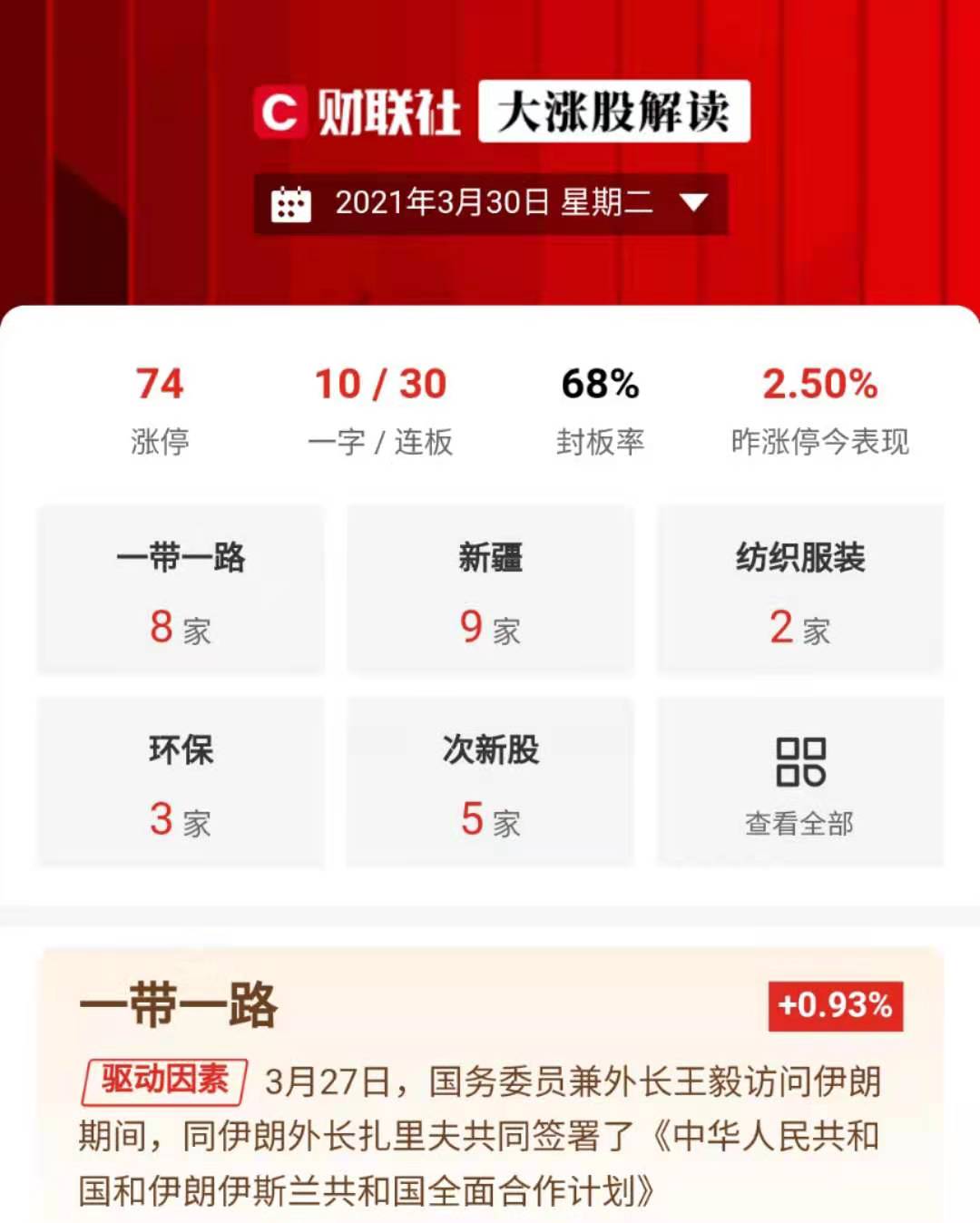 (上海,研究员 郑建宏)讯,从3月26日以来至今,A股部分地区板块接连上演涨停潮。这次地区性涨停潮主要以大基建题材为主线,自西向东逐步扩展。其中,新疆板块指数在3月26日及3月29日率先发动大涨行情,最终于3月30日上演涨停潮。3月30日《大涨股解读》市场热门板块以及今日新疆板块的大涨股如下图: