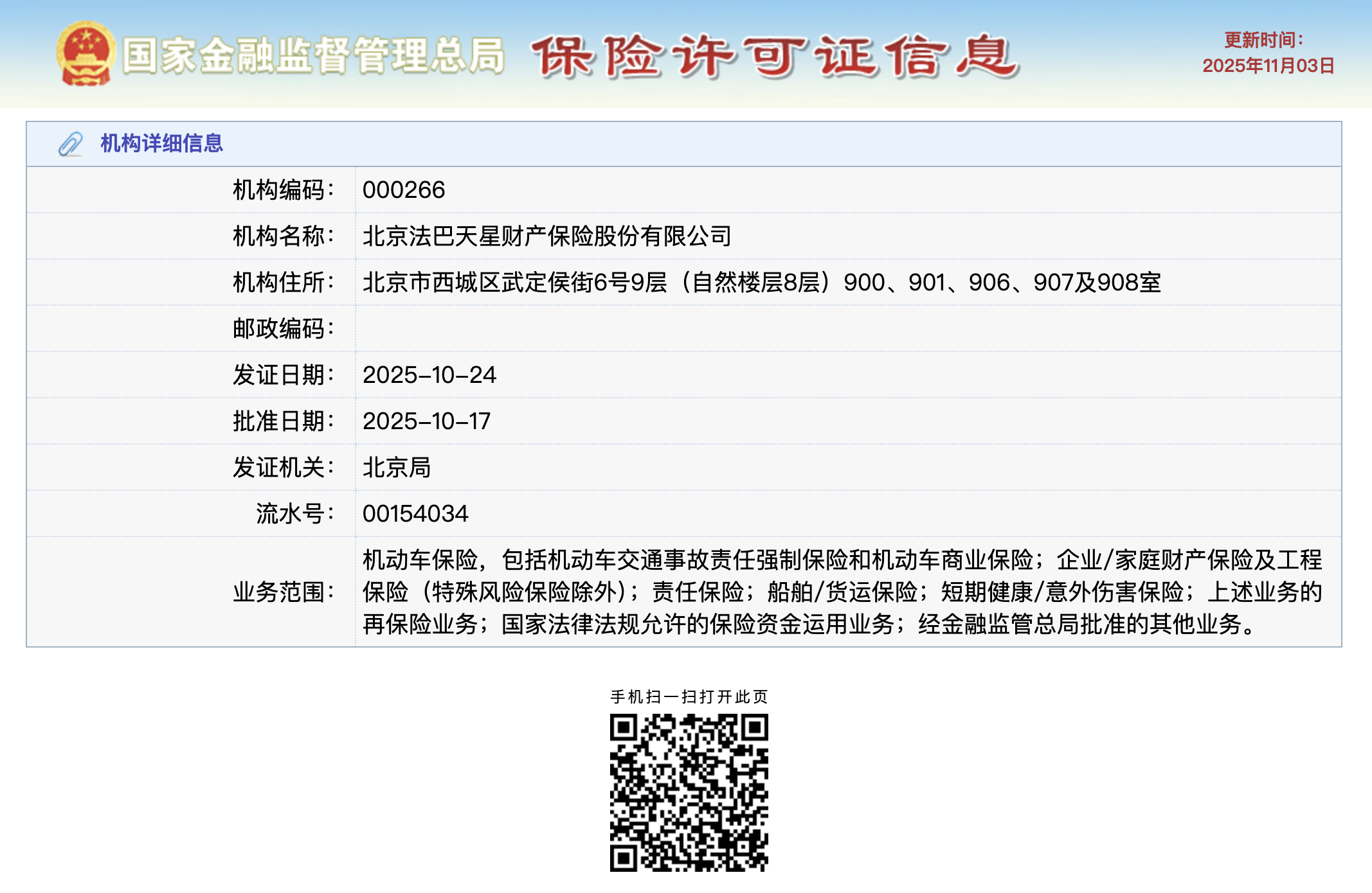 11月3日,记者注意到,国家金融监督管理总局保险许可证查询页面显示,法巴天星保险的机构编码为000266,发证日期为2025年10月24日,批准日期为2025年10月17日。