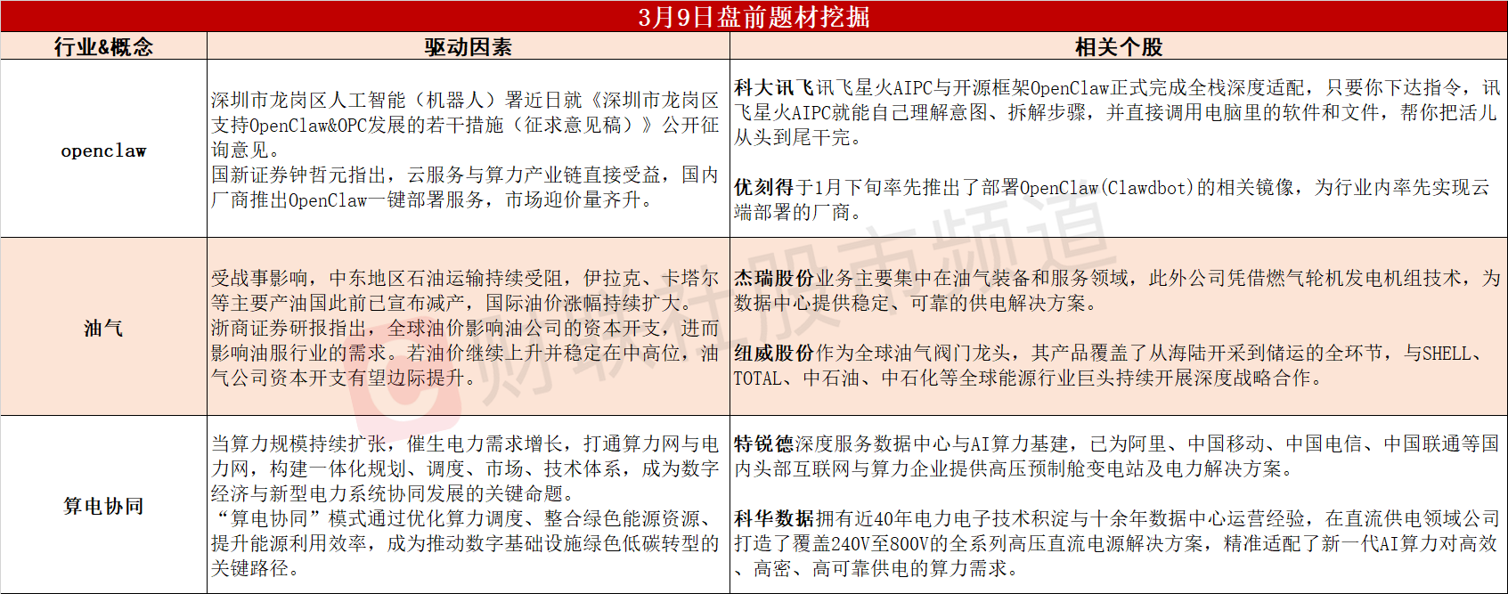 【盘前题材挖掘】①深圳拟出台措施支持OpenClaw&OPC发展,“小龙虾”概念有望站上风口。②国际油价一度突破每桶110美元,油服行业景气度有望边际提升。③算力规模扩张催生电力需求增长,“算电协同”有望快速推进。