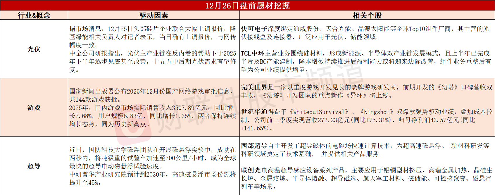 【盘前题材挖掘】①头部硅片企业联合大幅上调报价,2026年或成光伏产业链逆转之年。②12月版号出炉!147款新游获批,游戏行业供需两旺。③我国创造超导电动磁悬浮推进世界纪录,超导产业链迈入高速成长期。