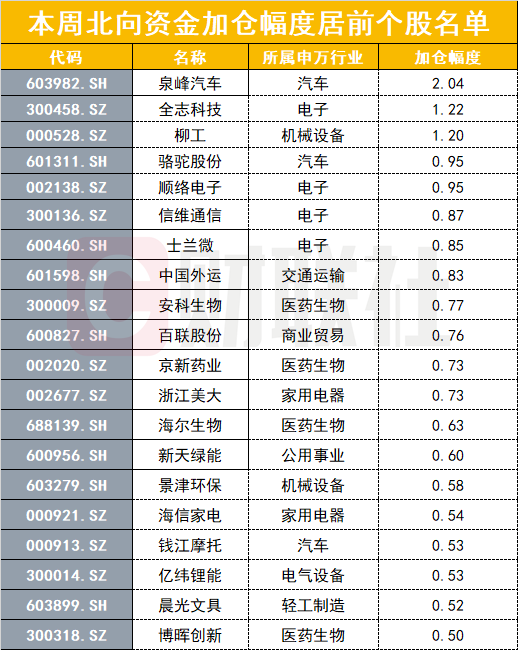 以北向资金增持股数占流通股比例来看,本周有20只个股北向加仓幅度在0.5%以上,主要集中在电子、汽车、家用电器、机械设备等行业。