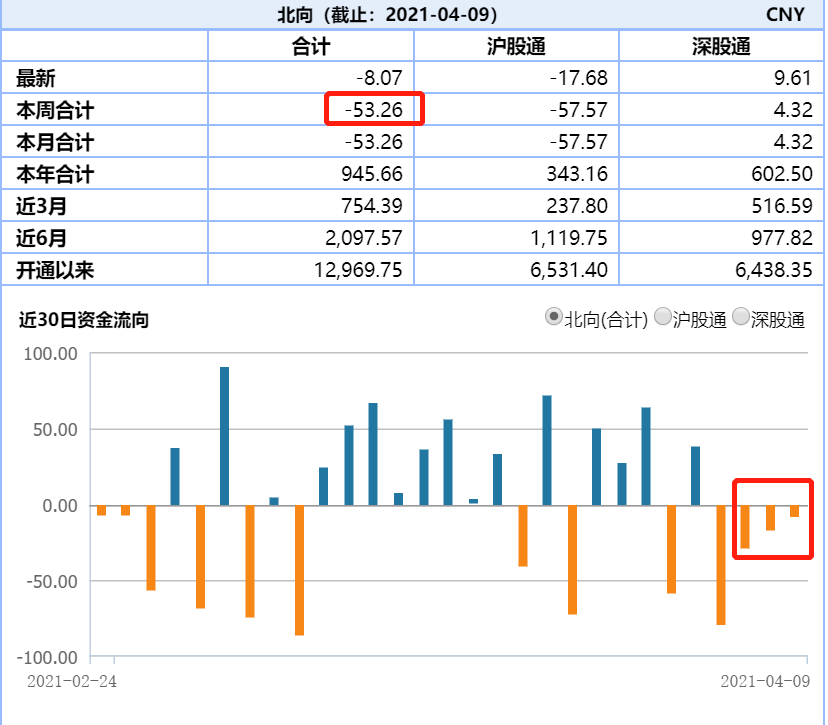 4月10日讯,因清明假期,北向资金本周仅交易3日。受大盘持续震荡影响,北向延续节前净流出态势,连续小幅卖出,合计金额达53.26亿元。