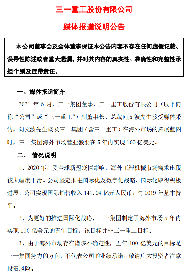 消息面上,三一重工8月2日晚间发布公告,就媒体报道进行了澄清:为更好的推进国际化战略,三一集团制定了海外市场 5 年内实现100亿美元的五年目标,该目标并非三一重工目标。由于海外市场存在诸多不确定性,五年100亿美元的目标是三一集团努力的方向,不代表公司的业绩承诺。