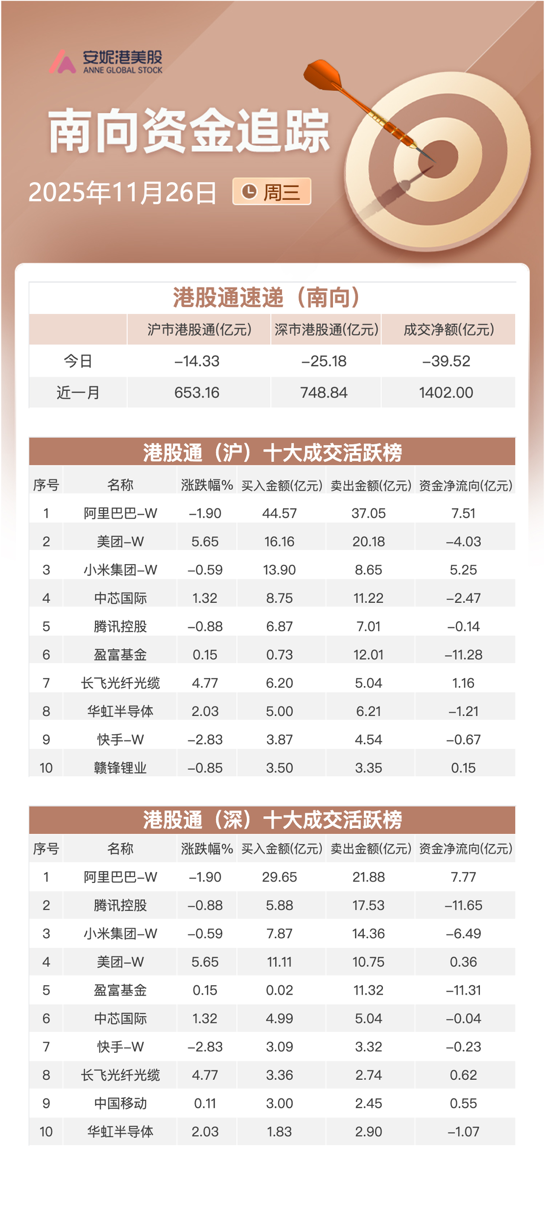 全天南向资金净卖出约39.52亿港元,连续流入趋势中断。其中,沪港股通净流出约14.33亿港元,深港股通净流出约25.18亿港元。
