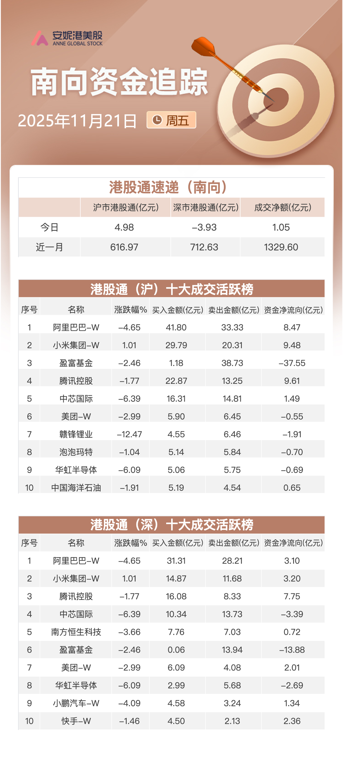今日,南向资金逆势净买入约1.05亿港元,其中沪港股通净流入约4.98亿港元,深港股通净流出约3.93亿港元。全天南向资金成交约1181.47亿港元,相当于恒指当日成交额的41.35%。