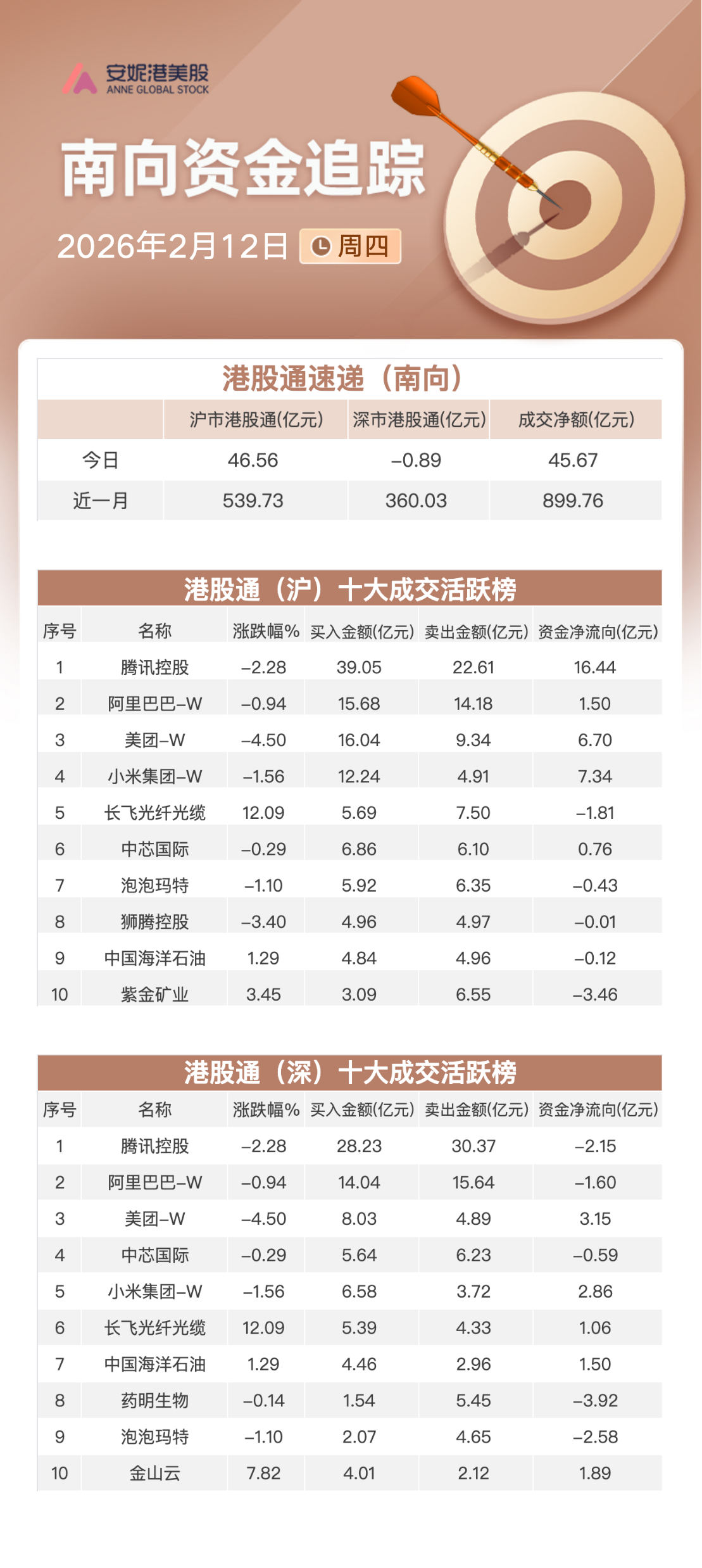 今日港股表现低迷,南向资金逆势流入约45.67亿港元。其中,沪港股通净流入约46.56亿港元,而深港股通净流出约0.89亿港元。