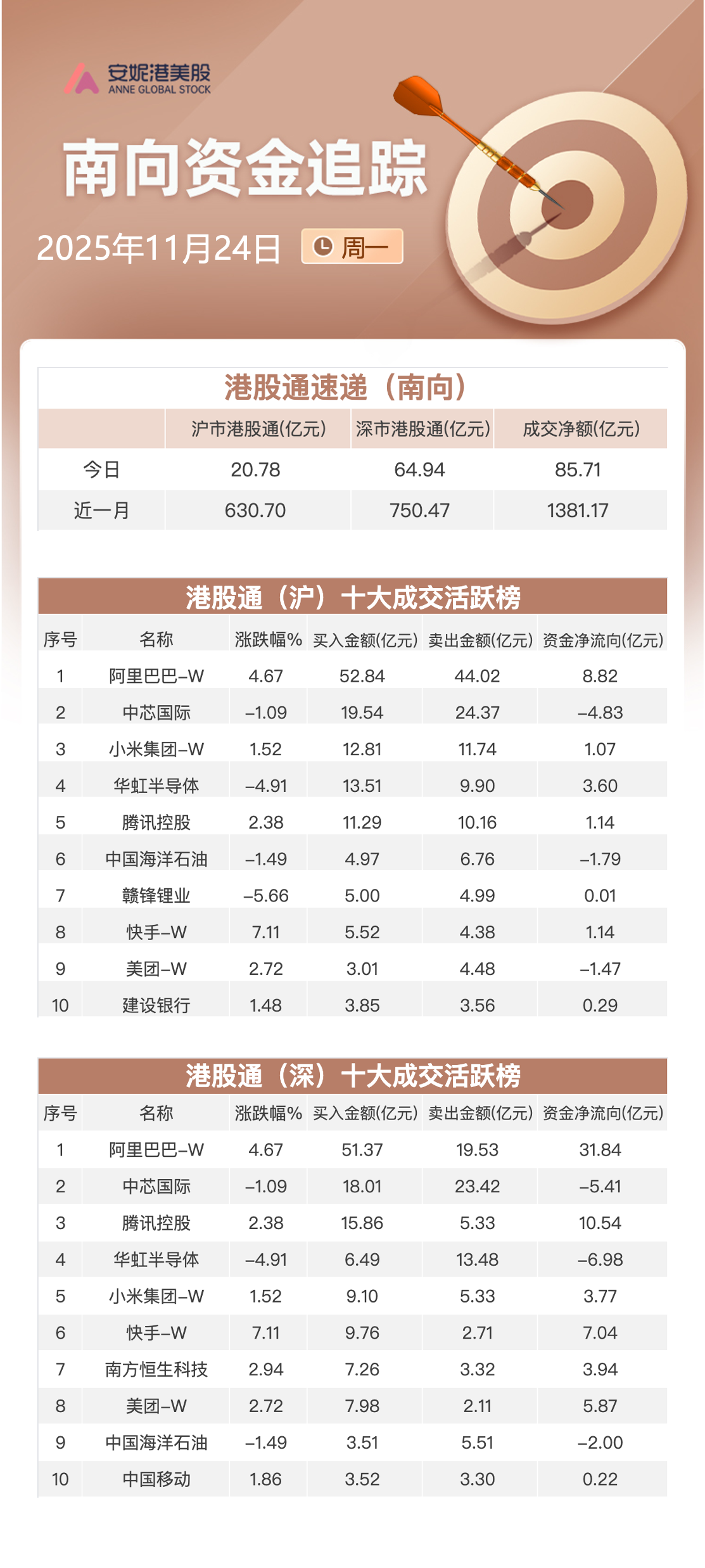 全天南向资金全天净买入约85.71亿港元。其中,沪港股通净流入约20.78亿港元,深港股通净流入约64.94亿港元。