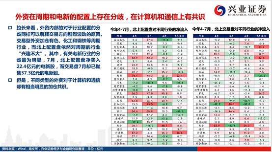 兴业证券研报还指出,外资内部的对于行业配置的分歧同样可以解释交易方向剧烈波动的原因。交易型外资加仓有色和化工等周期行业,而北上配置盘对周期板块“兴趣不大”,其中,有关电新行业的分歧最为明显,7月,北上配置盘净买入22.4亿元的电新股,而交易盘7月却已抛售37.3亿元的电新股。但是,不同类型的外资对于计算机和通信有相当明显的加仓共识。