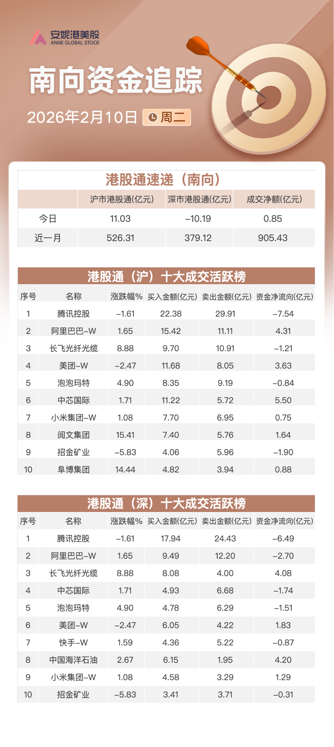 今日港股冲高回落,南向资金微幅流入约0.85亿港元。其中,沪港股通净流入约11.03亿港元,而深港股通净流出约10.19亿港元。
