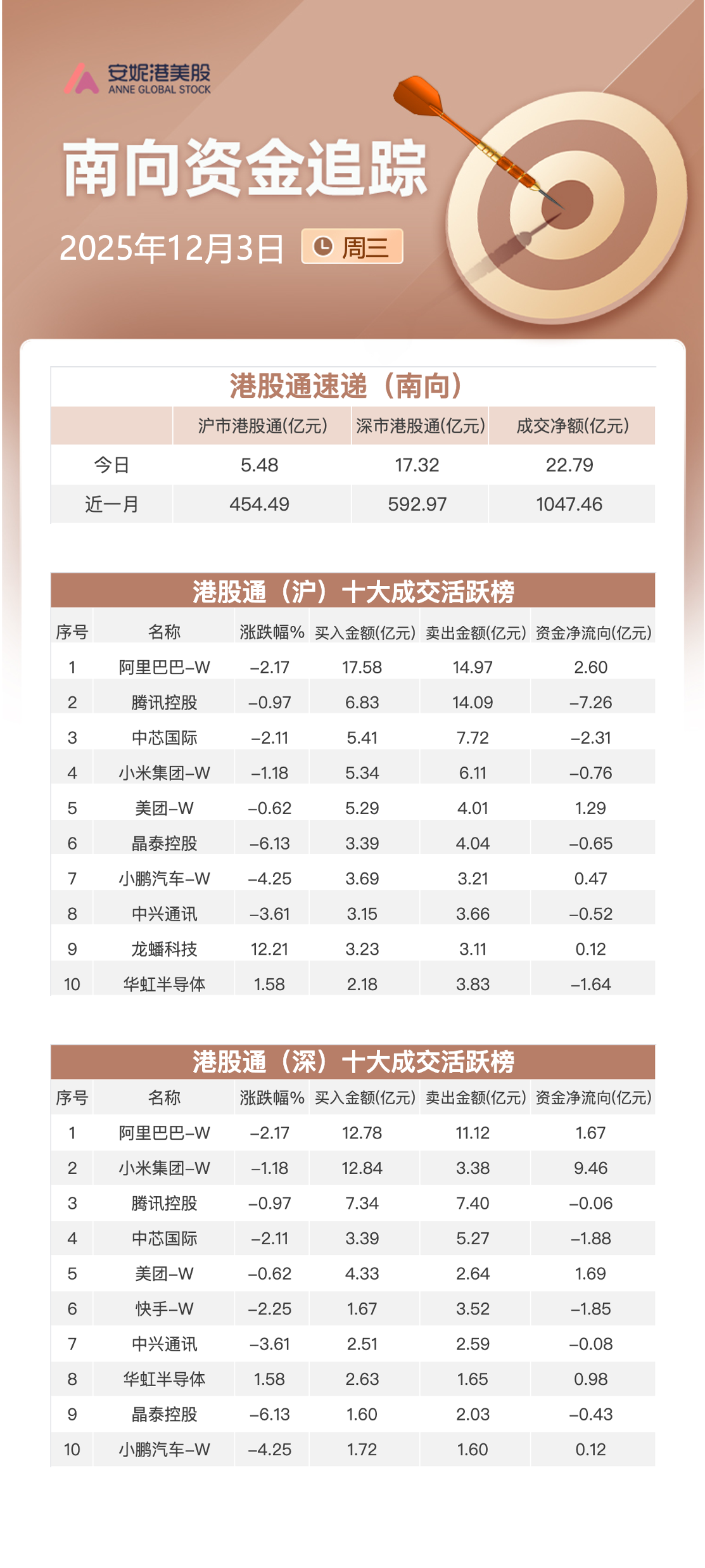 港股大市今日明显回落,但南向资金逆势净买入约22.79亿港元。其中,沪港股通净流入约5.48亿港元,深港股通净流入约17.32亿港元。