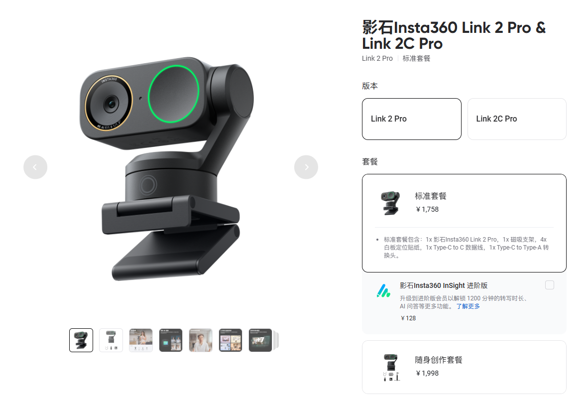其发售信息显示,Insta360 Link 2 Pro与Link 2C Pro于通过影石官方商城以及主流电商平台等渠道正式开售,首发标准套餐定价分别为1758元、1398元。