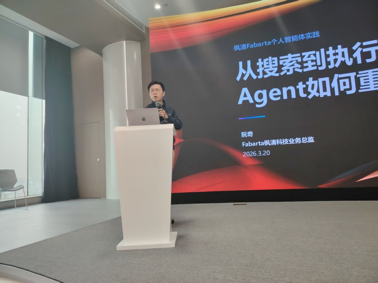 枫清科技业务总监阮奇以“从搜索到执行:AI智能体如何重构企业传播入口——Fabarta龙虾的实践”为题,系统阐释了当前传播入口重构趋势在C端已十分显著,并正加速向B端延伸。