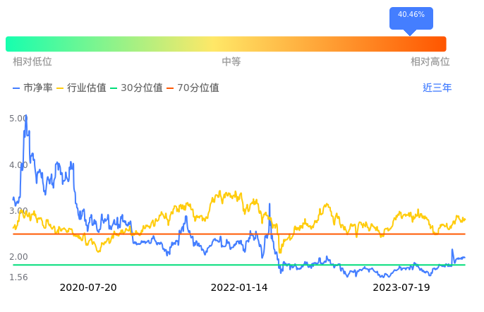 建科机械当前市净率PB为2.09,在所属的专用设备中,市净率PB排41,前五名分别为广日股份市净率0.75、长荣股份市净率1.02、越剑智能市净率1.13、克劳斯市净率1.17、润邦股份市净率1.20。建科机械当前市净率PB为1.99,超过近3年40.46%的历史数据。