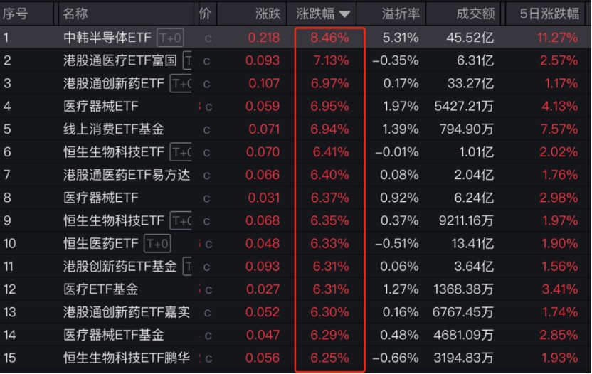 具体到单只产品上,华泰柏瑞中韩半导体ETF单日涨幅达8.46%,领跑场内千余只ETF。港股医药再次崛起,富国港股通医疗ETF、汇添富港股通创新药ETF分别以7.13%、6.97%的涨幅紧随其后。医疗器械ETF、线上消费 ETF等涨幅居前。
