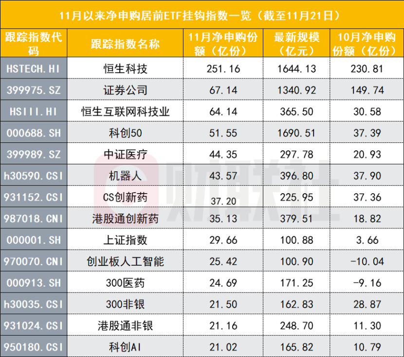 除了恒生科技指数,跟踪恒生互联网科技业指数的ETF也在11月被净申购64.14亿份,港股通创新药、港股通非银等指数挂钩的ETF也被净申购超过20亿份。